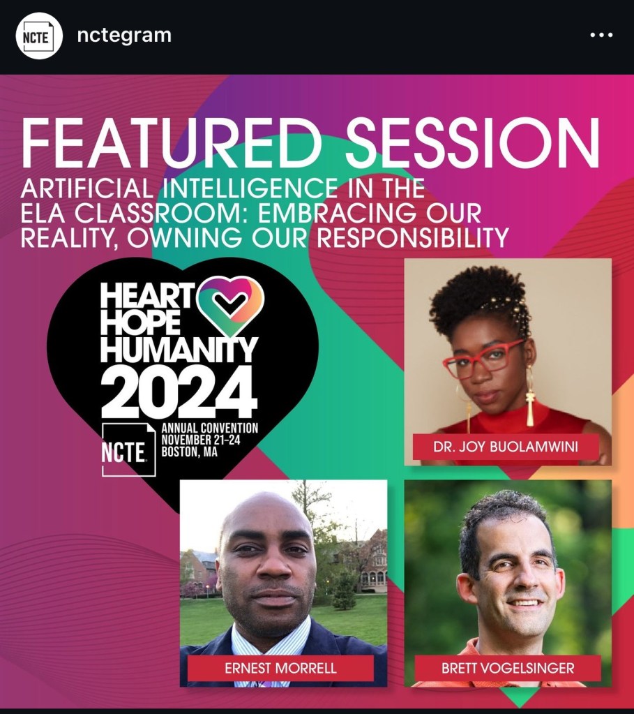 NCTE 2024, Boston, MA, Featured Session with Dr. Ernest Morrell and Dr. Joy Buolamwini: Artificial Intelligence In the ELA Classroom: Embracing Our Reality, Owning Our Responsibility